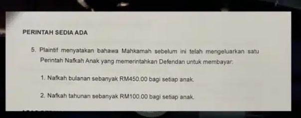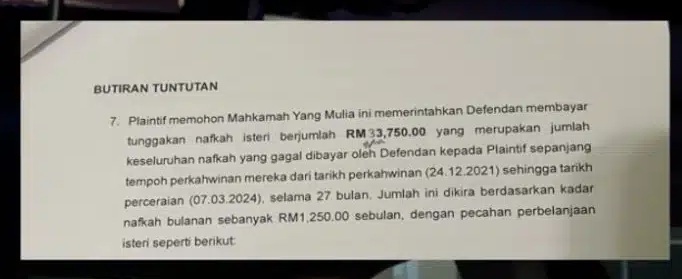 Setelah saya teliti di sosial media, katanya dia buat lima saman terhadap saya cuma yang saya tanda tangan semalam hanya dua saman iaitu yang pertama tunggakan nafkah isteri sebanyak RM33k. Dan satu lagi dokumen permohonan untuk menaikkan nafkah anak.